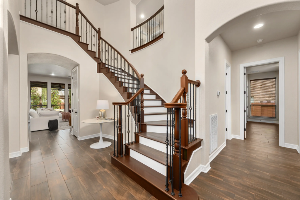 From the moment you step into the light-filled foyer, complete with soaring ceilings, rich wood accents, and a curved engineered hardwood staircase with iron and wood bannister, you’ll notice the attention to detail and designer upgrades throughout. The home features wood-look tile flooring downstairs, creating a warm and sophisticated foundation for daily living.