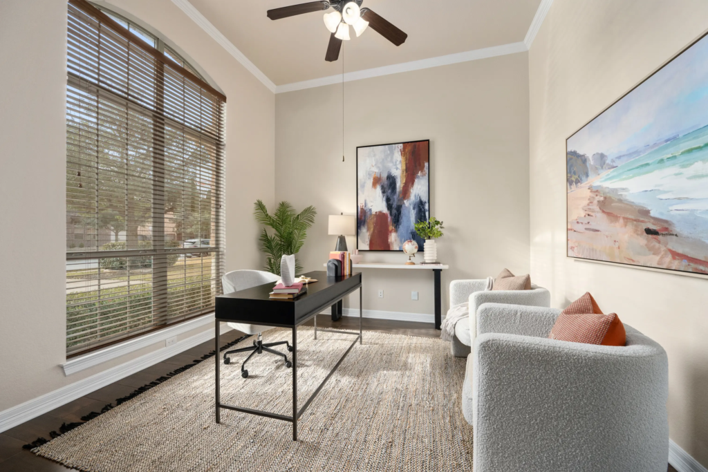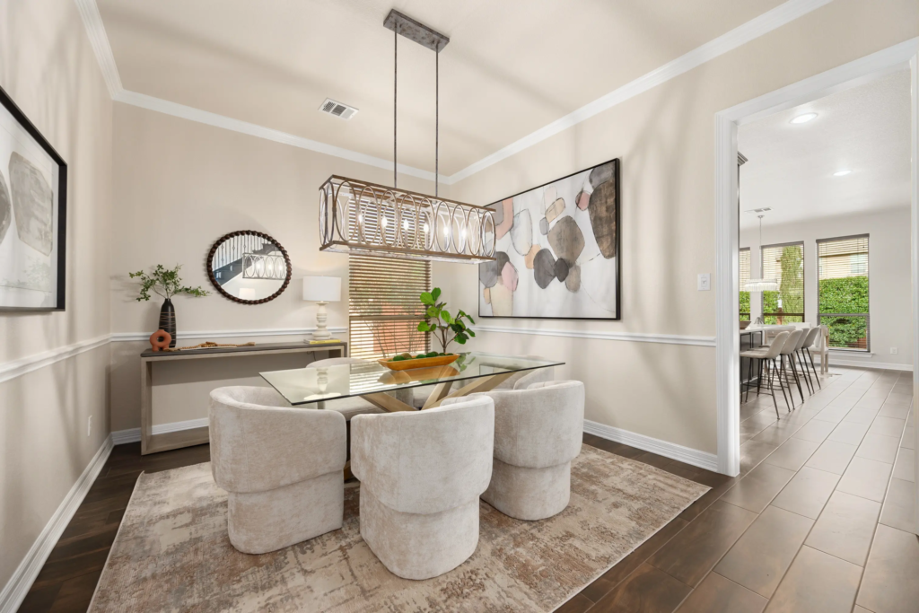 A dedicated office with crown molding and abundant natural light ensures a productive work-from-home environment. The formal dining room impresses with sculptural ambient lighting, crown molding, and chair molding, perfect for hosting memorable dinners and get-togethers.